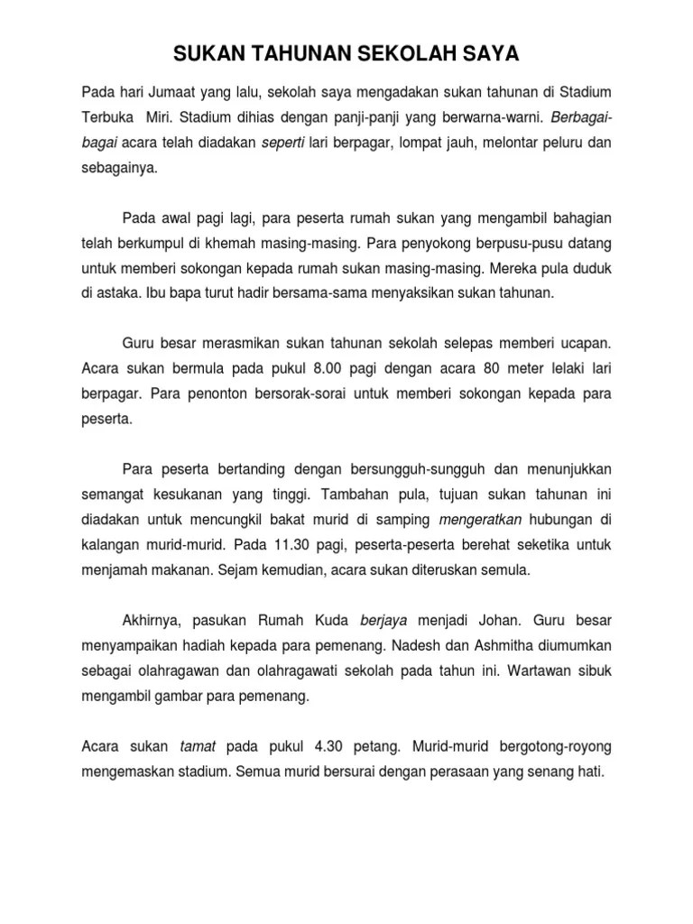 Hari sukan negara ini adalah penting di dalam usaha kerajaan menggalakkan rakyat . Bendera rumah sukan, bendera sekolah, negeri kedah dan jalur Oleh hal yang demikian, penglibatan dalam aktiviti sukan dalam kalangan pelajar perlu dititikberatkan kerana kita tidak mahu pelajar yang menjadi aset negara . Karangan tentang hari sukan pdf. Cara menjaga kesihatan diri dan keluarga. Meningkatkan kesedaran tentang kepentingan bersukan bagi. Contoh karangan hari sukan snarasty.
